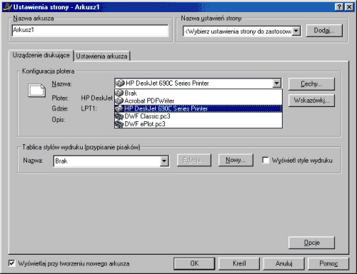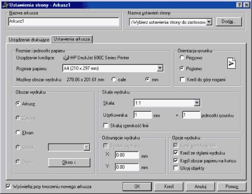 Jedną z zalet tego okna dialogowego jest możliwość przejścia za pomocą odpowiedniej zakładki do ustawień arkusza papieru, na którym dokonamy wydruku. Możemy ustawić tu orientację papieru oraz skalę globalną dla naszego arkusza.