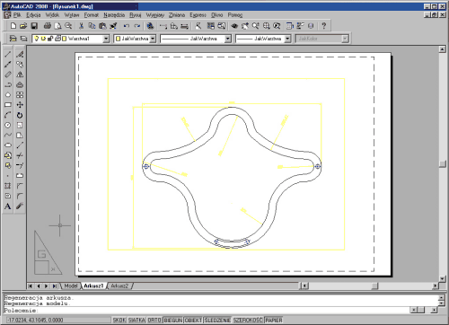 Kolejnym krokiem (po narysowaniu modelu) będzie przejście z obszaru modelu, w którym do tej pory rysowaliśmy, w obszar papieru. Aby tego dokonać, wciskamy zakładkę zatytułowaną Arkusz 1.