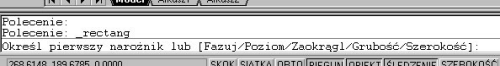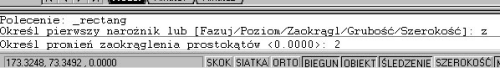 wskazujemy pierwszy narożnik, następnie drugi i otrzymujemy żądany prostokąt. Istnieje też możliwość narysowania prostokąta z zaokrąglonymi lub sfazowanymi narożnikami. Aby uzyskać dostęp do jednej z tych funkcji -- powiedzmy, że zdecydujemy się na zaokrąglenie narożników -- przed wstawieniem prostokąta na ekran czytamy wyświetlające się polecenia programu.