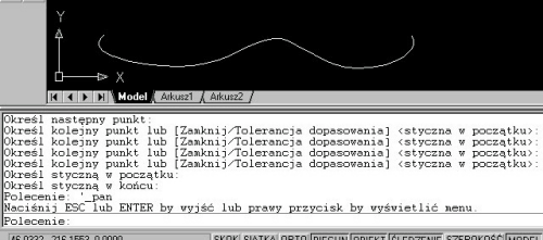 Najpierw określamy pierwszy punkt wstawienia, a następnie kolejne punkty, przez które powinien przechodzić rysowany splajn. Pozostaje nam jeszcze określenie kierunku stycznej dla początku i końca splajnu i mamy już wszystkie dane. Po wstawieniu dwóch kolejnych punktów wchodzących w skład rysowanego splajnu możemy podać tolerancje rysowania obiektu -- jeśli tolerancja jest równa zero, wtedy splajn będzie przechodził przez kolejne wstawiane punkty.