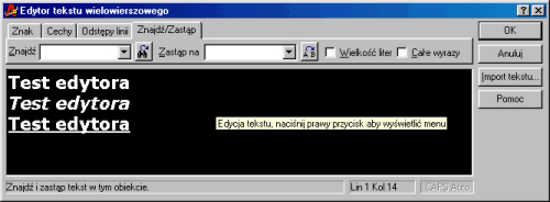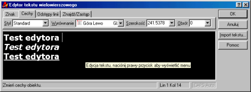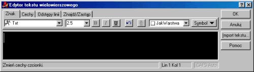 program automatycznie uruchamia Edytor tekstu wielowierszowego służący do wpisania odpowiedniego tekstu zapełniającego zaznaczony obszar.