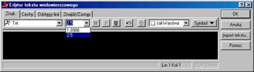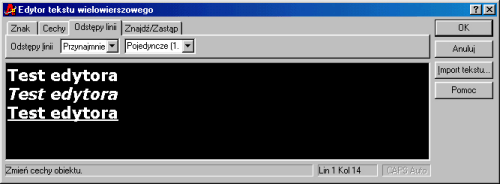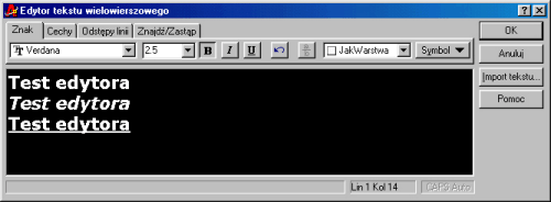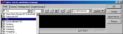 Edytor tekstu wielowierszowego pozwala na praktycznie nieograniczone interwencje w pisany tekst. Kolejne możliwości edycyjne są zgrupowane w postaci zakładek -- zacznę od przybliżenia pierwszej zakładki Znak. Zakładka ta pozwala na zmianę wyglądu wprowadzanych tekstów -- za jej pomocą możemy zmienić czcionkę.