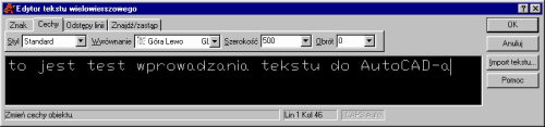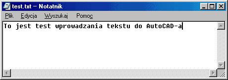 Ufff, przebrnęliśmy etap opisu okna dialogowego edytora, pora więc na odrobinę zabawy. Wczytamy sobie do AutoCAD-a tekst przygotowany w programie zewnętrznym. Otwieramy Notatnik i wpisujemy interesujący nas tekst.