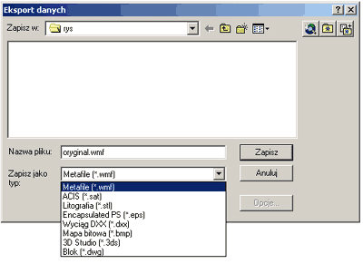 Jak widać na rysunku, w ten sam sposób możemy zapisać plik w formacie DXF, czyli w formacie wektorowym. Plik w takim formacie możemy następnie edytować zarówno w AutoCAD-zie, jak i innych aplikacjach graficznych. Możemy taki plik wyeksportować np. do programu CorelDRAW i tam nanieść stosowne poprawki. Wiele programów przeznaczonych do tworzenia grafiki i wspomagania projektowania akceptuje format DXF.