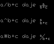 Rozpoczniemy sobie od wstawienia ułamków do tworzonego rysunku. Jak zapewne się domyślasz, Drogi Czytelniku, skorzystamy z Edytora tekstu wielowierszowego w celu przygotowania ułamków. Wstawianie ułamków jest uwarunkowane zastosowaniem odpowiedniego znaku oznaczającego dany typ ułamka. Poniżej przedstawię oznaczenia stosowane w AutoCAD-zie odnośnie wprowadzanych ułamków.