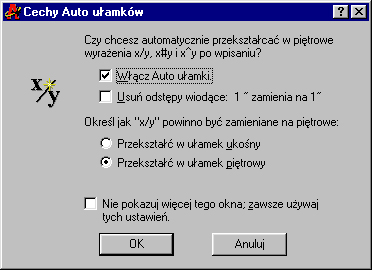 AutoCAD pozwala na autokonwersję wpisywanych liczb na ułamki. Jeśli pierwszy raz wpisujemy ciąg liczb oddzielonych znakiem /, ^ lub #, AutoCAD zadaje użytkownikowi pytanie odnośnie wprowadzania automatycznej zamiany liczb na ułamek -- robi to w formie okna dialogowego. Proponuję w oknie tym przeprowadzić poniższe ustawienia.