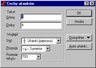 OK, teraz wiemy jak wstawiać ułamki, ale pozostaje pytanie: jak je edytować, kiedy są już wpisane? Nic prostszego -- klikamy tekst zawierającym ułamek, pojawia się automatycznie okno Edytora tekstu wielowierszowego, następnie klikamy prawym klawiszem myszy edytowany ułamek i wybieramy opcję Cechy. Teraz w oknie dialogowym możemy dowolnie modyfikować ułamek.