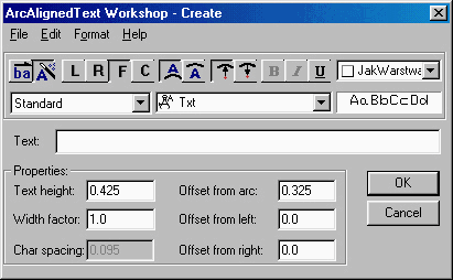 Narysujmy łuk o dowolnych parametrach. Następnie wybierzmy z menu Express -> Text -> Arc Aligned Text. Po uruchomieniu tej opcji naszym oczom ukaże się okno dialogowe pokazane poniżej.