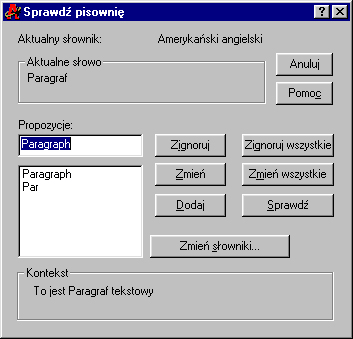 Ostatnim elementem, jaki omówię podczas tej lekcji, będzie sprawdzanie pisowni w AutoCAD-zie 2000. Jak każdy z nas niejednokrotnie się przekonał, człowiek jest istota omylną i robi błędy ortograficzne. Z tego powodu firma Autodesk wyposażyła swoje oprogramowanie w pakiet sprawdzający pisownię -- niestety program jest wyposażony jedynie w słownik ortograficzny języka angielskiego. Nic jednak straconego, ponieważ użytkownik sam może stworzyć interesujący go słownik z odpowiednią ilością używanych słów. Aby uruchomić sprawdzanie pisowni, klikamy kolejno Narzędzia -> Pisownia. Program prosi o wybranie odpowiednich elementów do sprawdzenia i w razie konieczności podaje użytkownikowi alternatywy.