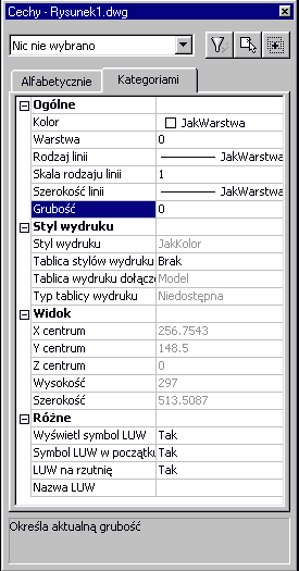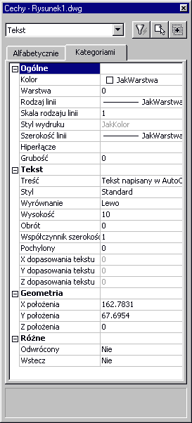 Jak widać, okno zostało przygotowane z myślą o wygodzie użytkownika. Zgrupowane w nim cechy obiektów zostały podzielone na odpowiednie kategorie. Jeśli jednak użytkownik woli, można je pogrupować w porządku alfabetycznym. Służą do tego poręczne zakładki: