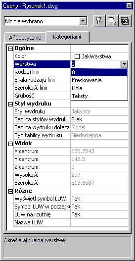 Jak widać na powyższym rysunku, istnieje wiele możliwości zmiany cech linii. Mimo to ja najczęściej używam tego właśnie okna do zmiany warstwy, na której linia jest aktualnie przechowywana.