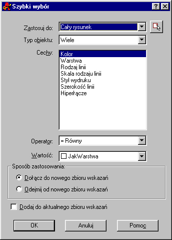 W oknie tym można szybko wybrać np. wszystkie teksty o wysokości równej 5 czy też większej od 10. Umożliwia ono szybkie wybranie np. linii leżących na warstwie 0, czy też okręgów o promieniu mniejszym od 2. Jak widać, narzędzie to jest bardzo przydatne i pozwala na nieograniczony wybór spośród wielu linii i napisów.
