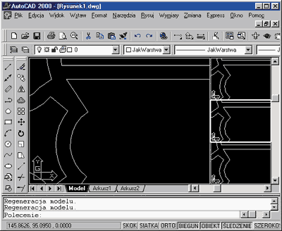 Jak widać, takie ustawienie elementów pozwala na rozbicie rysunku niejako na cztery mniejsze rysunki i oglądanie w tym samym czasie niezależnych fragmentów danego projektu. Dodajmy, że nazwa "widoki" jest każdorazowo umieszczana w cudzysłowach, ponieważ po prostu nie jest to prawidłowe określenie rzutni. Należy zaznaczyć, że "widoki" pozwalają na oglądanie rysunku w zależności od zastosowanego układu współrzędnych, ale o tym będzie mowa podczas kursu dla zaawansowanych użytkowników. Teraz pokażę, jak wprowadzić rzutnie do aktualnego projektu. Zaprezentuję jeden przykład -- moim zdaniem trudniejszy do opanowania, ale proponuję również przećwiczenie pozostałych kombinacji rzutni.