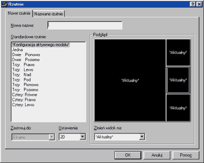 Tak więc do pracy. Klikamy kolejno: Widok->Rzutnie->Nowe rzutnie..., po czym AutoCAD w odpowiedzi pokaże okno dialogowe pozwalające na wybór odpowiedniej konfiguracji rzutni.