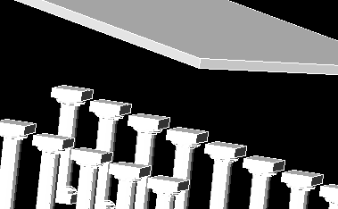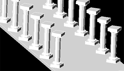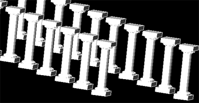 Teraz możemy już spokojnie powielić nasze dzieło w celu uzyskania odpowiedniego efektu. W tym celu użyjemy poznanego już - - z naszych "płaskich" lekcji -- narzędzia szyku. Podczas tworzenia szyku praktycznie postępujemy tak samo jak przy płaskich rysunkach. Jedynym ważnym elementem jest uruchomienie odpowiedniego widoku w celu odpowiedniego ustawienia szyku. Proponuję przećwiczenie tworzenia szyków w różnych widokach. A zatem po ustaleniu widoku i kliknięciu na ikonie narzędzia zaznaczamy obiekt, który ma być powielony w szyku, a następnie podajemy odpowiednie parametry szyku. Wynik naszego działania jest widoczny poniżej.