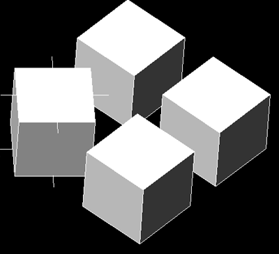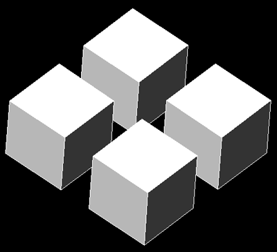 Oczywiście dla przypomnienia powiem, że w celu wykonania takiego rysunku możemy stworzyć jedną kostkę sześcienną, a następnie powielić ją przy pomocy szyku prostokątnego. Powiedzmy, że nasze zadanie jest nietypowe, - jest nim zaprojektowanie logo firmy. Mamy oczywiście taką koncepcję, aby logo było trójwymiarowe, oraz aby miało płaski odpowiednik. Ponadto musi być proste na tyle, aby można je było naszkicować" patykiem na piasku", jak mówią specjaliści branży reklamowej. A zatem, aby zaprojektować nasze logo do końca, dokonajmy obrotu jednej z kostek. W tym celu proponuję dorysowanie linii pomocniczych zdefiniowanych na górnych podstawach kostki.