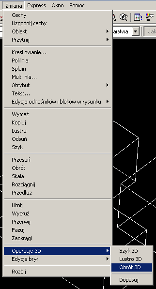 3D. Z menu Zmiana wybieramy opcję Operacje 3D,