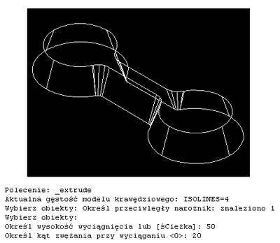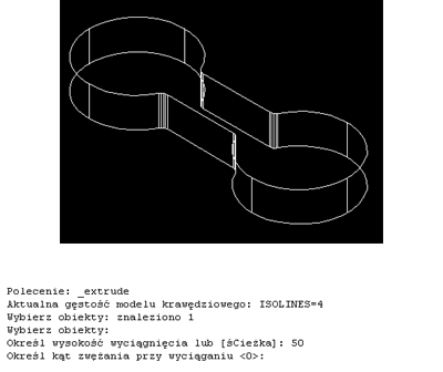 W tej chwili nic nie stoi na przeszkodzie, aby wyciągnąć nasz profil, nadając mu trzeci wymiar. Klikamy zatem ponownie na ikonie narzędzia Wyciągnij, następnie wskazujemy profil - będący już teraz polilinią. Po wyborze profilu zatwierdzamy wybór prawym klawiszem myszy i podajemy wysokość wyciągnięcia. Na zakończenie program zapyta o wielkość przewężenia wyciąganego elementu - proponuję tu podać wartość 0, ponieważ chcemy, aby nasz pierwszy wyciągany element nie posiadał ścianek bocznych o skośnych krawędziach (następne ćwiczenie wyjaśni pojęcie przewężenia). Nasze pierwsze wyciągnięcie jest gotowe.
